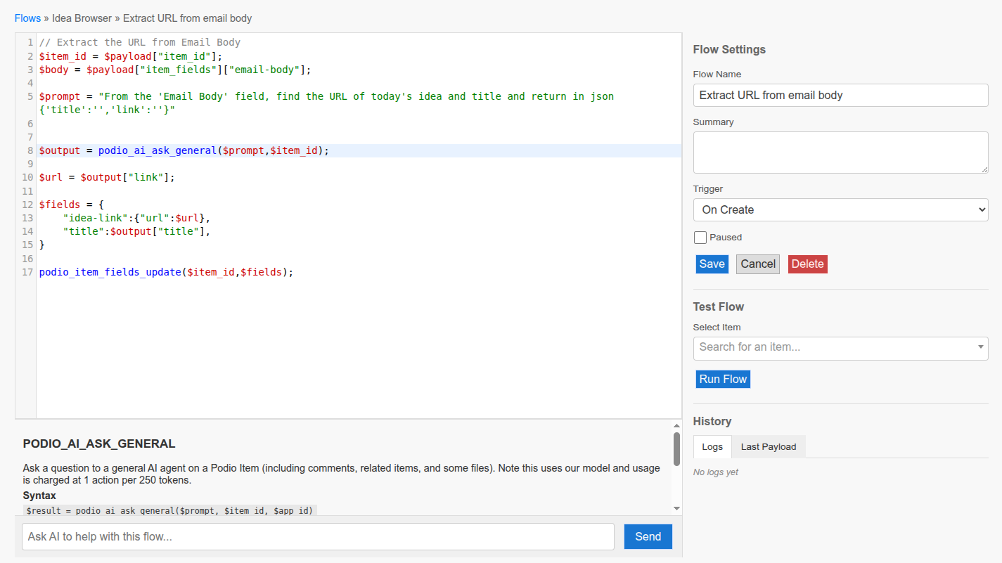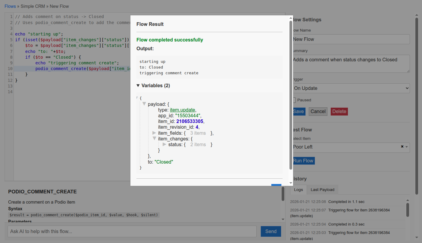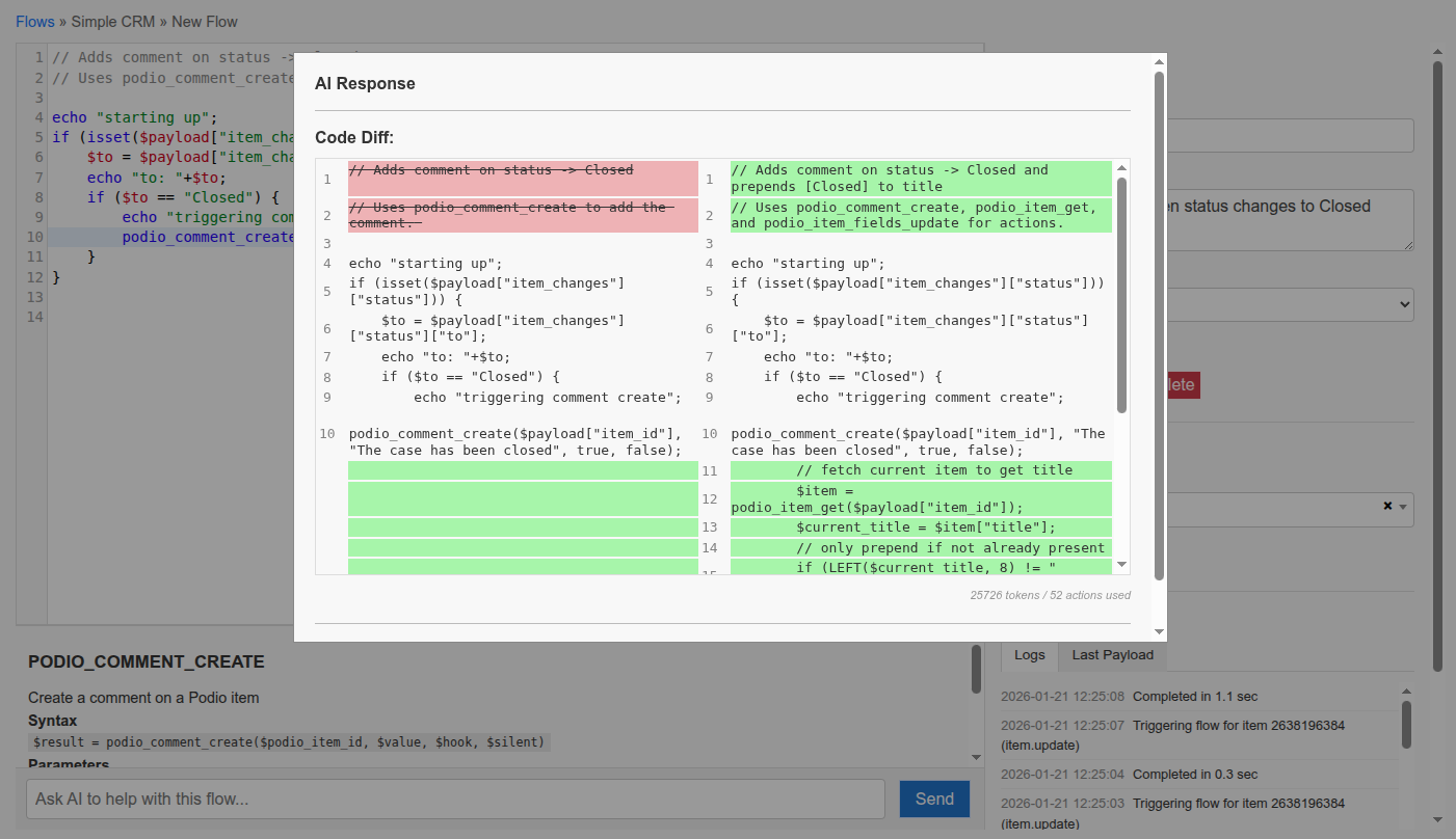 Podio's built-in workflows are limited and only for Podio Premium Users. ProcFu Flows let you write real code that triggers on any Podio event—with full access to AI, integrations, and 100+ functions - even if you're just a Podio Plus user.